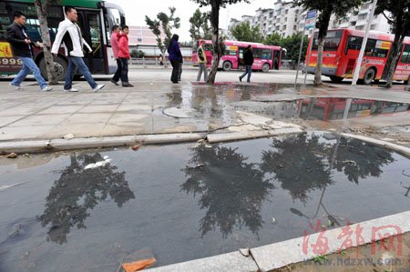 昨天下午,記者在現(xiàn)場看到,水坑大約有十幾平方米,隱隱有酸臭味撲面而來!斑@幾天剛下過雨,氣味已經(jīng)好了很多!睒I(yè)主周先生 說,年前氣溫高的那兩三天,臭味能熏到三四十米開外的樓層,許多住戶大熱天不敢開窗。記者注意到,這個水坑正好位于108公交車的終點(diǎn)站,距離站牌不過三四米。因此,附近居民等車時,不得不挨著水坑,碰到上下班高峰期,常有人被擠到坑里,弄得一身酸臭。