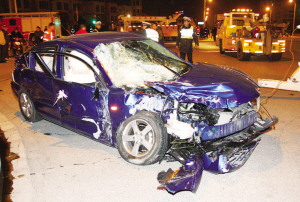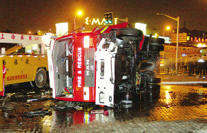 昨天(19日)下午5時15分許,(上海)浦東御橋路浦三路口處發(fā)生意外,一輛消防車與一小轎車在行駛中發(fā)生碰撞,消防車在沖倒路邊的欄桿和燈柱后側(cè)翻在地,小汽車則被反向甩出近20米遠,車內(nèi)一名新婚女子和一3月大的男嬰身受重傷,情勢危急,另有十余人輕傷。