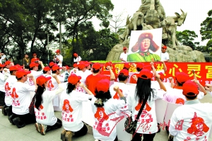 宣誓完畢,活動(dòng)進(jìn)入高潮,“老板們”后退一步,轉(zhuǎn)過身來面對著雷鋒畫像,齊齊雙膝跪地,以表示“對雷鋒精神的虔誠和最高敬意”,然后起立對畫像三鞠躬。隨后,這些人又向路人散發(fā)活動(dòng)的紅色文化帽和文化衫,以號召更多人“向雷鋒同志學(xué)習(xí)”,把雷鋒精神轉(zhuǎn)化為自己的“心靈財(cái)富”。