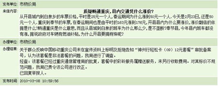 市民在公開郵箱中明確反映,春運(yùn)期間,由開縣城內(nèi)往返白泉鄉(xiāng)的車票價格從平日的25元漲至50元,瘋狂漲價不知依據(jù)為何?讓人忍俊不禁的是,市物價局的回復(fù)圍繞著一條對通訊行業(yè)投訴的展開,答非所問。