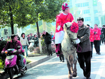 新郎周先生和新娘肖小姐都是80后人,對于中國古典文化頗為癡迷。在勾勒自己的婚禮時(shí),在國外留學(xué)多年的肖小姐希望能像中國古典小說中描述的一樣,新郎騎馬前導(dǎo),新娘花轎及嫁妝后隨,鑼鼓鞭炮迎至男家。