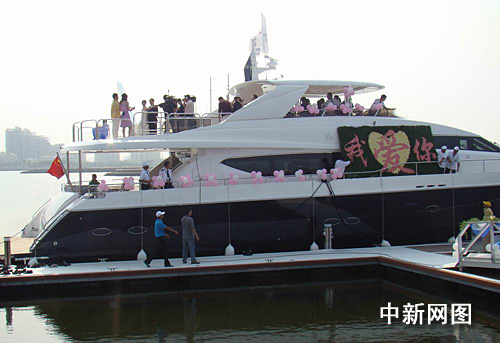 中新網(wǎng)?3月20日電(付美斌)“從這一刻起,我將始終與你為伴,將我的一生交付與你,共同分享、共同承擔(dān)所有的未來……”3月20日下午3時許,一對“新人”在?跒撑弦凰覂r值6000萬元的公主級豪華游艇上舉行浪漫婚禮。據(jù)悉,這是游艇婚禮首現(xiàn)海南島,該場婚禮花費25999元。