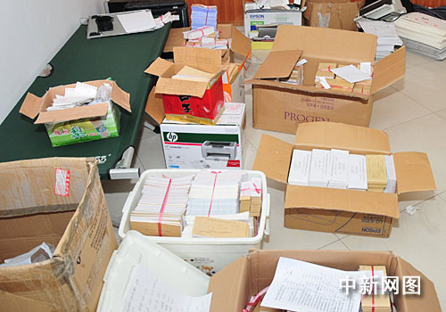 據(jù)悉,警方共奔赴13個(gè)抓捕點(diǎn)。記者在一個(gè)抓捕點(diǎn)看到,除了一張上下鋪鋼絲床,其余地方都被各類(lèi)的紙箱占據(jù)。民警隨意打開(kāi)地上的紙箱,里面都是各式各樣的假發(fā)票,不僅是浙江省范圍內(nèi)的,上海、山東、江蘇等地的假發(fā)票也隨地都是。經(jīng)清點(diǎn),民警一共繳獲各類(lèi)假發(fā)票21.3萬(wàn)份,同時(shí)還繳獲了3套電腦、打印機(jī)、掃描儀等印制發(fā)票用普通設(shè)備以及400余枚開(kāi)具假發(fā)票所使用的偽造公章、假證等作案工具。