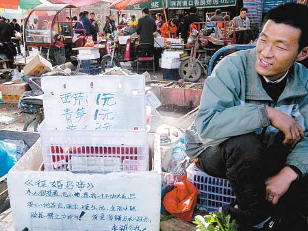 昨日下午,在位于南關(guān)路立交橋下,與寶雞市路燈管理處相對的攤位前,記者見到了正在賣菜的余東陽。短發(fā)、濃眉、皮膚黝黑,笑容有點(diǎn)像《天下無賊》里的“傻根”,小伙子看上去的確像菜攤旁他的征婚啟事上介紹的那樣,“很普通,也不帥”,但一周來,他已經(jīng)成了周圍菜販和很多買菜市民津津樂道的話題人物。