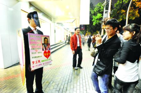 這一次,“阿凡達(dá)”出現(xiàn)在福州八一七路南街公交站附近的人行道上,只見他身上掛著一塊牌子,手里還捧著一塊,上面寫著:“哥膝下有黃金”,“哥喊你來福州相親”,“鳳姐明天我要嫁給你”,“一見鐘情”,“求求你,迷戀哥,哥真的不是傳說”……更引人注意的是,他手上捧著的那塊牌子上,還有一張羅玉鳳的照片。
