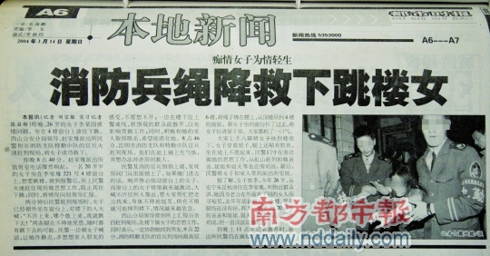 2004年3月13日,昆明李家堆221號,26歲的李某站在窗臺上,準備第二次自殺。據(jù)稱因為丈夫與其他女人有染,她去年曾經(jīng)跳過一次樓,沒有死成,此時腿上還有傷。這次,她被迅速趕來的民警勸說緩了一緩。消防員從樓上繩降而下,成功把她給救了下來。