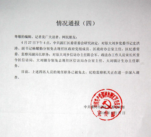 27日,漯河市源匯區(qū)委宣傳部通報(bào)說,中共源匯區(qū)委常委會(huì)研究決定,對(duì)原大劉鄉(xiāng)黨委書記史洪濤、副書記楊耀勤分別免去現(xiàn)任區(qū)政府黨組成員、區(qū)政府辦公室主任,區(qū)紀(jì)委常委、監(jiān)察局副局長(zhǎng)職務(wù);對(duì)原大劉鄉(xiāng)信訪辦主任陳會(huì)軍、政法辦工作人員宋長(zhǎng)興責(zé)令區(qū)信訪局、大劉鎮(zhèn)分別免去現(xiàn)任區(qū)信訪局辦公室主任、大劉鎮(zhèn)計(jì)生辦主任職務(wù)。目前,上述四名人員的現(xiàn)任職務(wù)已被免去。