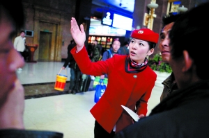 昨日,北京站,換上新裝的女客運員在為旅客指路。當日,北京站和北京南站的女客運員,全部換上了“空姐式”新裝,讓很多乘客眼前一亮。北京站有關(guān)人士表示,此前女客運員為深藍色大蓋帽套裝,此次統(tǒng)一換為紅色掐腰上衣、黑色長褲、紅禮帽、彩色絲巾。而更換新裝,主要是改變乘客對客運員嚴肅的老印象,服裝的暖色調(diào),也可拉近乘客與客運員的距離。在更換新裝的同時,火車站也將提升服務(wù)水平,為旅客提供“空乘式” 服務(wù)。本報記者 王嘉寧 劉澤寧 實習(xí)生 周琦 攝影報道