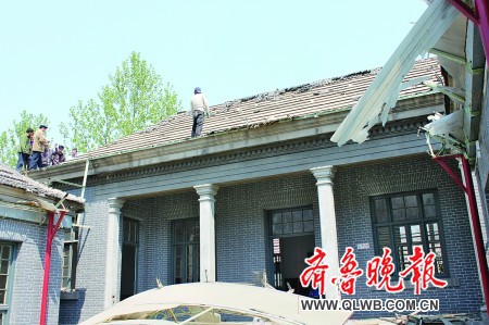 4月30日上午,濟(jì)南市中山公園東片區(qū)拆遷工作在緊張進(jìn)行。經(jīng)四路343號(hào)大院里,有幾個(gè)人翻墻入院爬到屋頂上揭瓦,濟(jì)南市體育局所屬的濟(jì)南市民體質(zhì)監(jiān)測(cè)中心工作人員正在阻止他們上到房頂揭瓦!跋旅嫖葑永镞有人呢,怎么就這么拆房?”