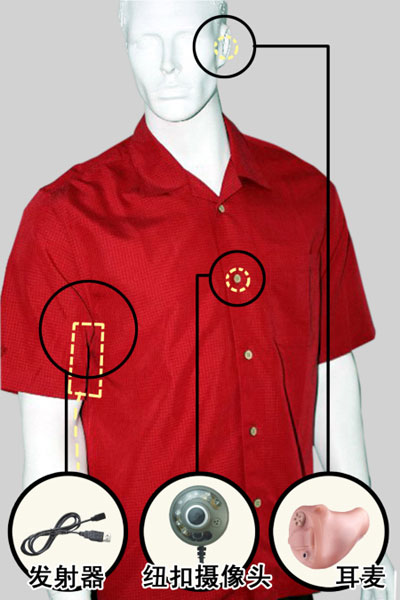 作弊考生進考場前,要帶上電子遙控設備、米粒耳麥,穿上安裝有針孔攝像頭的衣服。