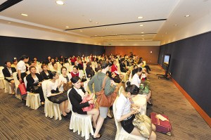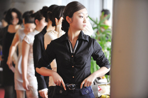 候場區(qū),美女云集的地方,只要一個(gè)轉(zhuǎn)身,你就可以看見近千名佳麗有的在偷偷補(bǔ)妝,有的對著鏡子練習(xí)微笑。在等候面試的美女中,有帶著綠色美瞳的美國加州留學(xué)生,有穿背帶褲剛剛高中畢業(yè)的學(xué)生,還有身著職業(yè)裝想換個(gè)工作的公司白領(lǐng)!艾F(xiàn)在工作不好找,所以只要有招聘就來試試咯!边@是記者在現(xiàn)場聽到最多的一句話。