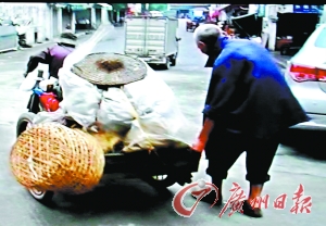 在穿梭的車流中,陳老伯弓著腰,吃力地拉著歪歪扭扭的平板車在大馬路上緩慢前行,車輛在他身邊飛馳而過,老人究竟要去哪里呀?“我要拉去清新縣逕口,要走3個小時啊,”從老伯含糊不清的言語中,記者得知,原來這對年齡加起來160歲的老夫妻每天凌晨3時多就要起身,從20多公里外的城郊拉車徒步進城,到了市場已經(jīng)天亮,接著他們分頭去揀一些爛菜葉等裝好車,再一路拉回去喂豬,到了家里已是月上梢頭。一個8旬老伯拉著平板車從松崗市場去清新逕口,就算是一個正常人行路,也要走幾個小時,別說是拉車了。陳伯的舉動吸引了不少人的好奇的目光,他為何要這樣折磨自己?
