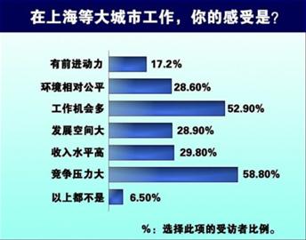 調(diào)查顯示,在上海工作生活多年的受訪者,對(duì)這座城市感受最直接的是:競(jìng)爭(zhēng)壓力大位列第一,達(dá)到58.8%;其次是工作機(jī)會(huì)多,達(dá)到52.9%;第三是收入水平高,為29.8%。