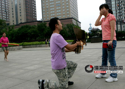 “胡安萱,我好愛好愛你!”70米長的大紅橫幅從象征“幸!钡哪μ燧喩洗瓜,長沙小伙王樂手捧玫瑰單膝下跪向女友求婚:“老婆,嫁給我吧,我們生個兒子讓他早點(diǎn)過兒童節(jié)!”