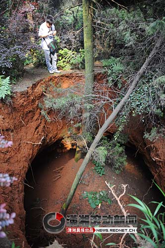 金福喜推測(cè)“天坑”產(chǎn)生的過(guò)程:數(shù)萬(wàn)年甚至數(shù)百萬(wàn)年前,此處地下就存在一個(gè)溶洞。長(zhǎng)沙進(jìn)入雨季,地下水位上漲,溶洞內(nèi)空氣被壓縮,向上沖撞土層;停雨時(shí)地下水位下降,洞內(nèi)氣壓降低,土層被向內(nèi)“吸”!斑@里是山坡,水位變化快,溶洞內(nèi)就像有一只打氣筒,對(duì)表層土壤的破壞很大。加上外界雨水沖刷,力度達(dá)到一定程度時(shí),土層就垮塌了。”
