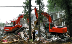 8時30分許,東北角被拉上了警戒線,城管、公安和消防部門進行了拆遷前最后的清場。9時整,7臺挖掘機開始同時向盛佳網(wǎng)絡(luò)公寓掘進,不到半小時,3層小樓的外立面已面目全非。同時,東北角的另外幾棟待拆公寓也開始動工,華倫公寓的平房被逐一推倒、金唐公寓變?yōu)榱艘欢淹叩[。
