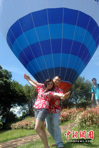 全國(guó)的30支熱氣球隊(duì)來助興。在?谌f(wàn)綠園上空漂游的熱氣球上,北京的劉先生突然“變出”一枚鉆戒向女友求婚。他笑著說,從網(wǎng)上看到?诼糜位閼c的消息就瞞著女友報(bào)了名,為的是上演在熱氣球上求婚一幕。