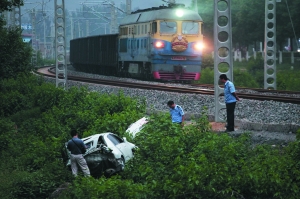 昨日(13日)下午,京承鐵路線順義區(qū)李天路鐵道口,一輛本田轎車闖過道桿,與一列貨運(yùn)列車尾部相撞。轎車內(nèi)母子被救出,此時(shí)一列客運(yùn)列車開來,轎車又被撞出數(shù)十米遠(yuǎn)并跌落在路旁溝內(nèi)。