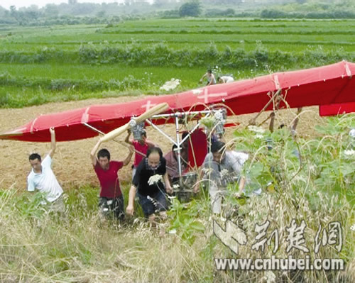 5月10日,武漢東湖開發(fā)區(qū)農(nóng)民舒滿勝,花費10萬元自造土飛機,試飛失敗并受皮外傷。昨日上午,舒滿勝的土飛機再次試飛,未像上次一樣通知媒體,當?shù)夭糠执迕衲繐袅巳^程。據(jù)目擊者胡先生介紹,昨日上午9時許,舒滿勝的土飛機就被拉到江夏區(qū)五里界鎮(zhèn)醬栗廟路段,在經(jīng)過三四十分鐘的試驗性滑行后,于上午10時準時起飛。土飛機“助跑”約200米后,舒滿勝拉動起飛桿,飛機輪滑輪脫離地面,機身離地面只有兩三米,飛行不過10米,一頭栽進路邊稻田里(如圖),舒滿勝被甩出飛機左腿受傷。隨后,舒滿勝被送往流芳醫(yī)院。經(jīng)檢查,其左腿髕骨骨折,需手術(shù)治療。