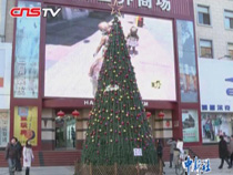 【解說(shuō)】圣誕樹(shù)上掛滿了中國(guó)“福”,穿著唐裝的圣誕老人向顧客們送上糖果,古箏、二胡、琵琶等中國(guó)樂(lè)器彈奏著中國(guó)名曲《茉莉花》,余音裊裊。