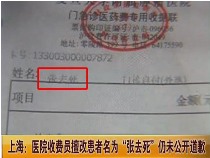 醫(yī)院收費(fèi)員擅改患者名為"張去死"尚未道歉