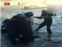 轎車側(cè)滑墜入冰河 百人喊號子合力救援