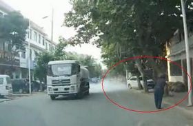 行車拍攝:司機加速為路邊老太擋水