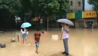 牛人與洪水“斗智斗勇” 騎馬踩高蹺水中出行