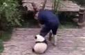 萌熊貓“騷擾”飼養(yǎng)員不撒手