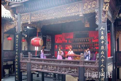 古戲臺(tái)上身著漢服的演員