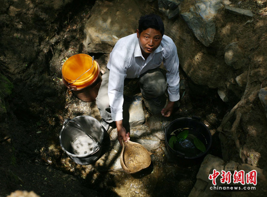 圖:四川攀枝花旱區(qū)村民尋找新水源打水