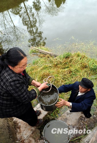 四川宜賓旱區(qū)的老人從水窖里取水