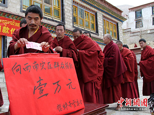 圖:拉薩哲蚌寺為中國(guó)西南旱災(zāi)地區(qū)捐款