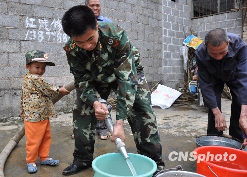 圖:消防官兵為貴州黔西南旱區(qū)百姓送水