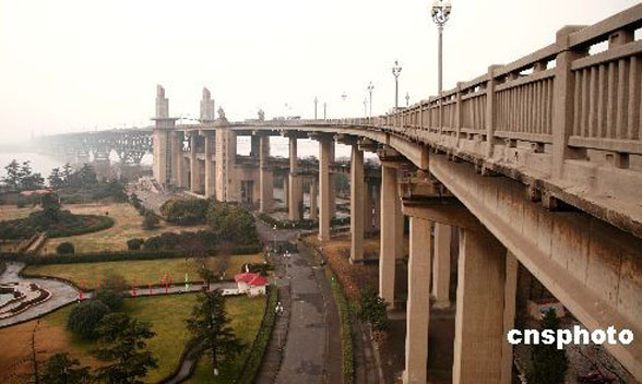 南京長江大橋江中正橋共有9墩10孔,每個橋墩高80米,每墩底部面積400多平方米,比一個籃球場還大,最高的橋墩從基礎(chǔ)到頂部高85米。墩與墩之間的距離除北岸第一孔是128米外,其余9孔均為160米,橋下可行萬噸巨輪。正橋兩端有4座70多米高的橋頭堡。整座大橋如彩虹凌空江上,巖床埋在正橋河床33~47米以下,9個橋墩基礎(chǔ)分別采用重型混凝土沉井、鋼沉井加管柱、浮式鋼筋混凝土沉井、鋼板樁圍堰管柱等基礎(chǔ)。正橋10孔鋼筋梁中9孔為160米跨度,采用優(yōu)質(zhì)合金鋼桿件在現(xiàn)場鉚接拼裝架設(shè)。