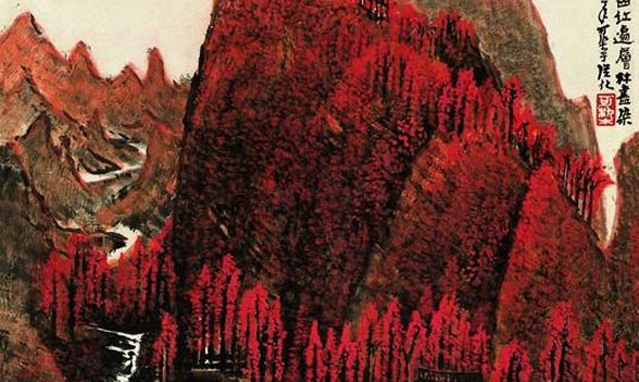 《萬山紅遍層林盡染》是根據(jù)毛澤東詩詞《沁園春·長沙》所作。李可染喜讀毛主席詩詞,并從那激越豪邁的詩里領(lǐng)略山水畫的境界。此畫是據(jù)“萬山紅遍,層林盡染”句意再造了一個(gè)藝術(shù)世界,在黑紅對比中寫南國深秋景色,帶有理想化的詩意色彩。