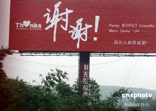 震區(qū)宣傳牌多國語言感謝中國和國際社會
