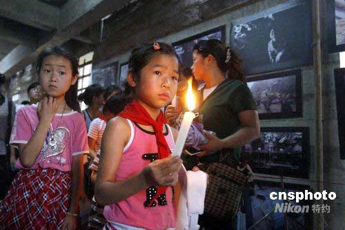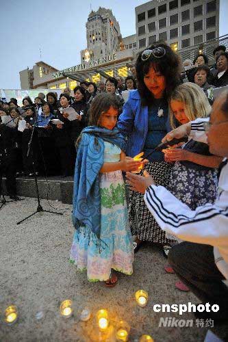 圖:美國女童為汶川地震遇難者點燃燭光
