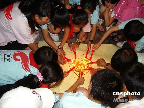 四川災(zāi)區(qū)孩子用紅色燭油作心型字寄相思