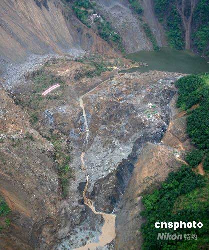 圖:山體滑坡煙塵籠罩下的汶川縣城