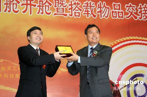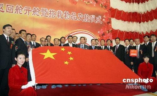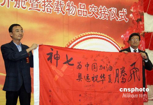 圖:“神七”載人飛船總設(shè)計師張柏楠移交返回艙搭載簽名旗幟