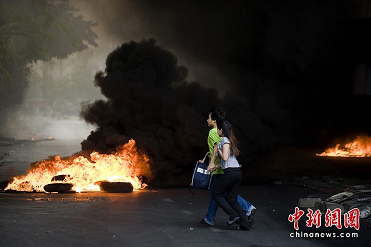 “紅衫軍”在一所醫(yī)院附近集會(huì)并燃燒輪胎