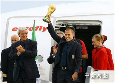 中新網(wǎng)7月12日電 據(jù)新京報(bào)報(bào)道,第四次登頂世界杯的意大利隊(duì)昨天凌晨乘坐專機(jī)回到了祖國(guó),當(dāng)飛機(jī)在羅馬郊區(qū)的海軍機(jī)場(chǎng)著陸后,一場(chǎng)席卷意大利全國(guó)的慶;顒(dòng)拉開了序幕。意大利隊(duì)全體成員被授予共和國(guó)勛章。