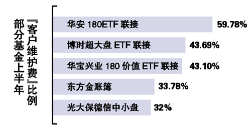 具體來(lái)看,18家已公布半年報(bào)的基金管理公司,上半年平均向渠道支出了13.76%的管理費(fèi)用于“客戶維護(hù)”。其中,支出“客戶維護(hù)費(fèi)”占其管理費(fèi)收入最高的三家公司,分別為長(zhǎng)信基金、東方基金、光大保德信基金,三家公司各自支出了自身管理費(fèi)的23.61%、22.25%、20.98%用于“客戶維護(hù)”。而從單個(gè)基金出發(fā),這個(gè)數(shù)據(jù)則更為驚人。整體來(lái)說(shuō),業(yè)內(nèi)最高三至五成的費(fèi)用支出比例仍然讓人咋舌。