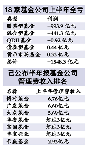 18家基金公司旗下234只基金的半年報(bào)面世,基金業(yè)利益鏈昭然若揭:今年上半年,已披露半年報(bào)的基金共計(jì)虧掉基民1548億元,但基金公司管理費(fèi)收入不減反增,半年大賺51.13億元, 比去年同期多收了16.01%;基金銷售渠道更是坐收漁利,上述基金上半年共計(jì)支出客戶管理費(fèi)高達(dá)7.04億元,同比增長(zhǎng)了13.28%。