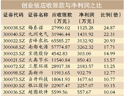 同花順資訊統(tǒng)計顯示,創(chuàng)業(yè)板公司應收賬款竟是凈利潤20倍以上的公司有3家,其中梅泰諾(300038)的應收賬款竟是凈利潤的24.87倍,位居榜首;九洲電氣(300040)的應收賬款竟是凈利潤的22倍,位居第二。應收賬款與凈利潤之比大于10倍的有11家。創(chuàng)業(yè)板中,應收賬款最低的是三五互聯(lián)(300051.SZ),其中報凈利潤為1694.27萬元,而應收賬款僅為157.97萬元。