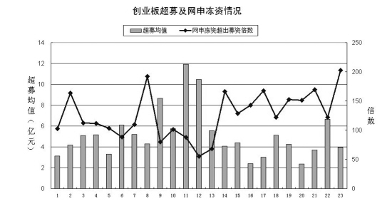 若按創(chuàng)業(yè)板上市公司計劃的募集資金,則板塊的初始規(guī)模也將小得多。統(tǒng)計顯示,前23批創(chuàng)業(yè)板股首發(fā)預(yù)計募資總額為276.82億元,而首發(fā)募資總額卻比其超出577.80億元,超募比例高達2.09倍,平均每家公司超募4.82億元。事實上,板塊超募比例在1倍以上的個股多達103只,占總數(shù)的86%,可見對創(chuàng)業(yè)板而言,超募就是一種常態(tài)。