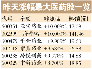 近日,國家工信部、衛(wèi)生部、國家食品藥品監(jiān)督管理局聯(lián)合發(fā)布《關(guān)于加快醫(yī)藥行業(yè)結(jié)構(gòu)調(diào)整的指導(dǎo)意見》,支持我國醫(yī)藥產(chǎn)業(yè)發(fā)展。并且對于對大型企業(yè)跨省(區(qū)、市)重組后的改擴項目優(yōu)先予以核準(zhǔn),在股票發(fā)行、企業(yè)債券、中期票據(jù)以及銀行貸款方面給予支持,從而提高整個行業(yè)的產(chǎn)業(yè)集中度,培養(yǎng)大型醫(yī)藥集團,提高醫(yī)藥產(chǎn)業(yè)集中度。受此消息影響,昨天醫(yī)藥板塊表現(xiàn)十分搶眼。