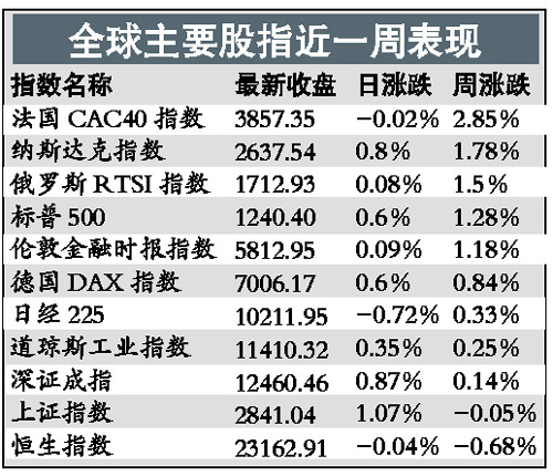 雖然中國A股近期萎靡不振,但其他多數(shù)股指表現(xiàn)搶眼,其中,受利好數(shù)據(jù)提振,美國道瓊斯指數(shù)上周五報收11410.32點,上漲0.35%,且已經(jīng)實現(xiàn)連續(xù)兩周走高。其中,納斯達(dá)克收盤創(chuàng)下2007年12月以來的新高。而法國股市更是以2.85%的單周漲幅領(lǐng)漲全球股市。