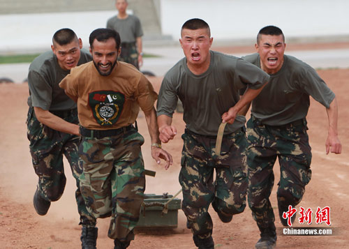 7月4日,參加“友誼—2010”中國(guó)巴基斯坦反恐聯(lián)合訓(xùn)練的兩軍士兵進(jìn)行體能訓(xùn)練。此次訓(xùn)練在中國(guó)寧夏青銅峽地區(qū)展開,主要以邊境地區(qū)山地聯(lián)合反恐作戰(zhàn)為課題,分為展示交流、混編同訓(xùn)、綜合演練三個(gè)階段。這是兩國(guó)之間舉行的第三次反恐聯(lián)合訓(xùn)練。中新社發(fā) 杜洋 攝